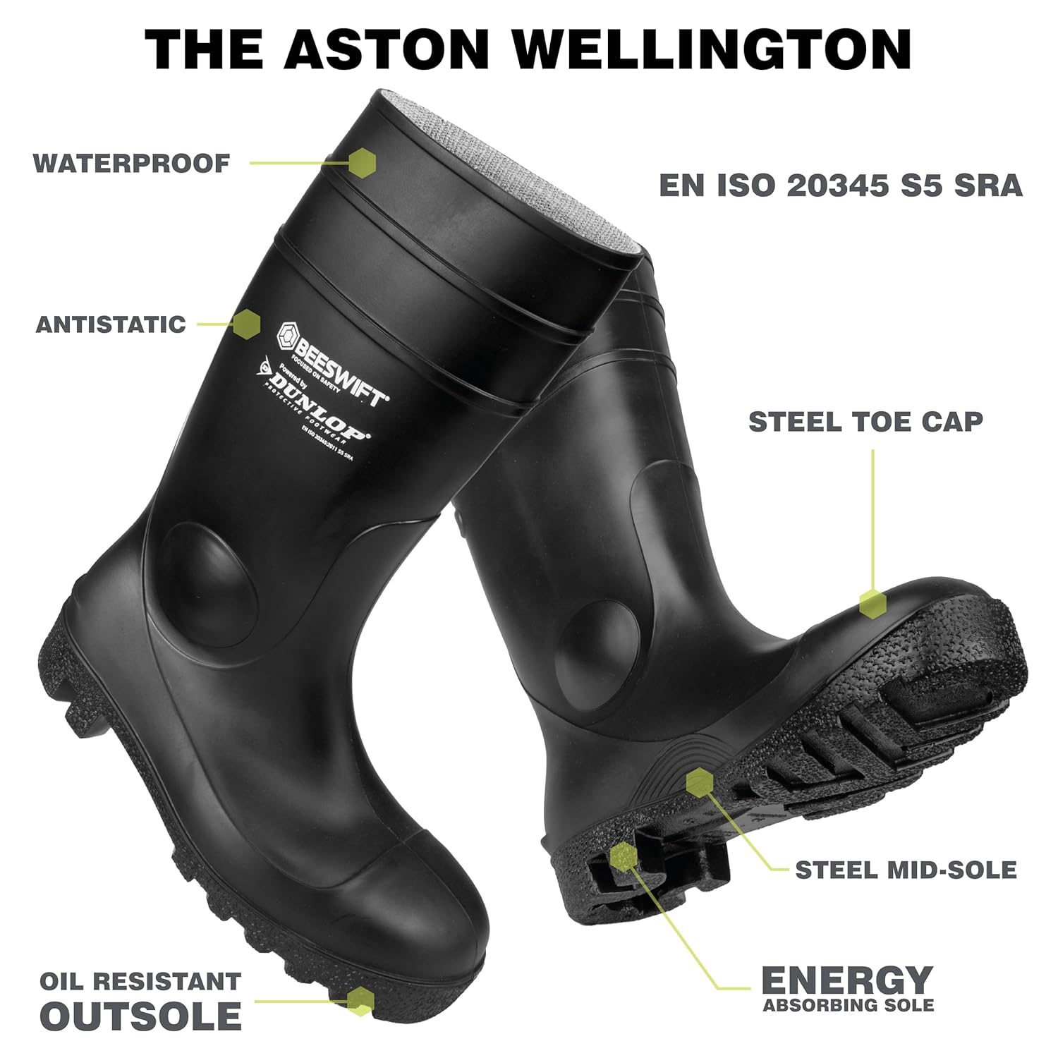 • The Aston Wellingtons combine protection and comfort with a slip-resistant grip on the soles to ensure safe working conditions. The wellies have a steel toecap and a steel midsole to protect against penetrating and falling objects that may impact your feet in any work or outdoor environment.