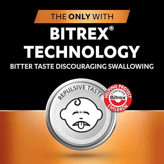- BABY SECURE TECHNOLOGY: A non-toxic bitter taste ring-shaped layer with Bitrex applied on both sides of the cell to discourage swallowing by babies and toddlers.