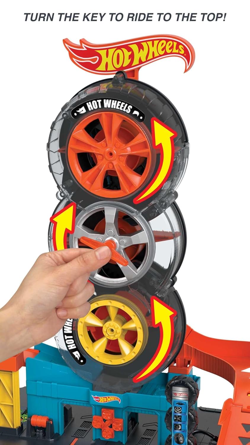 Hot Wheels City Super Twist Tire Shop Playset, Spin the Key to Make Cars Travel Through the Tires, Includes 1 Hot Wheels Car, Gift for Kids 4 to 8 Years Old, HDP02