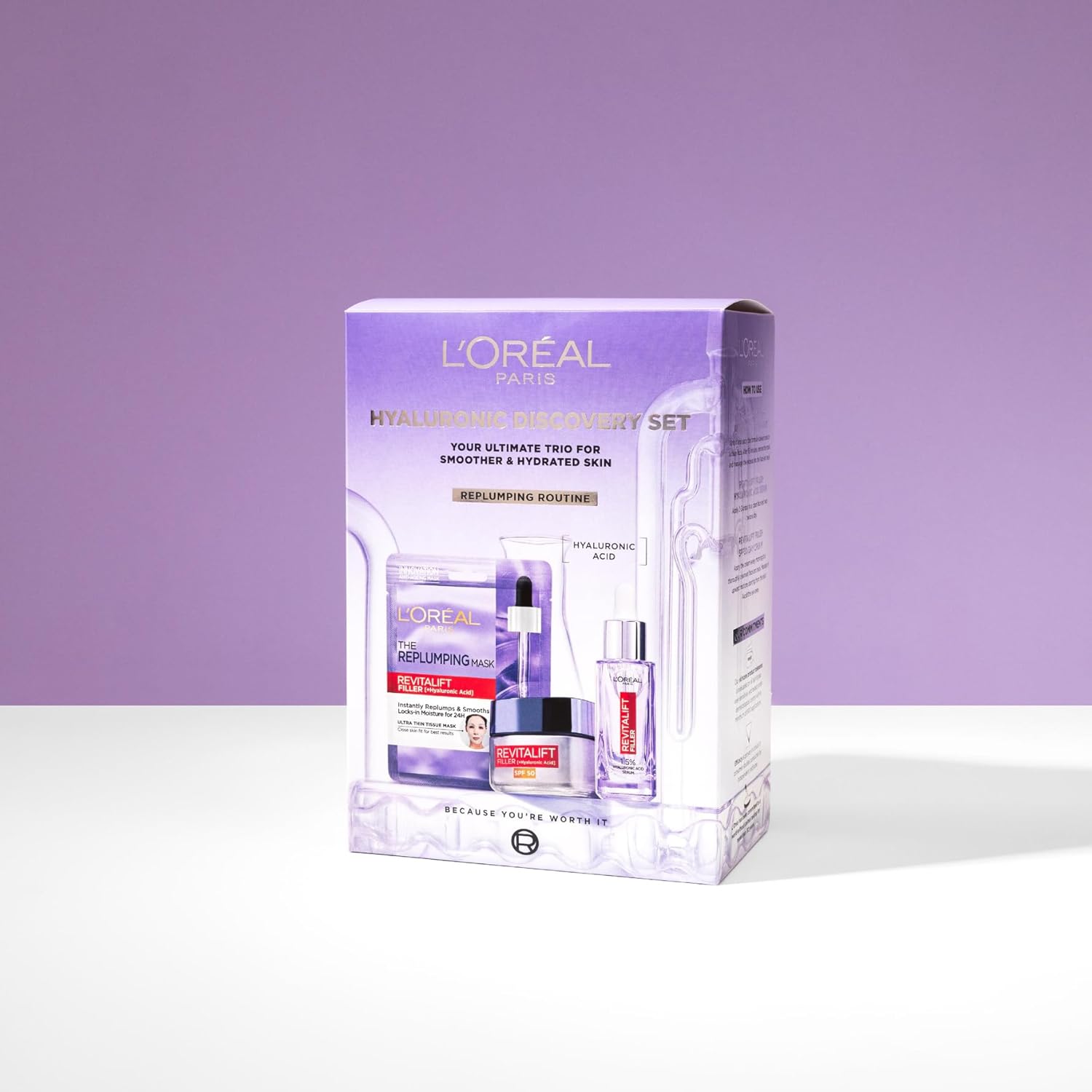 L’Oréal Paris Hyaluronic Discovery Set Gift Set – Revitalift Filler 1.5% Hyaluronic Acid Serum, Day cream and Replumping Tissue Mask
