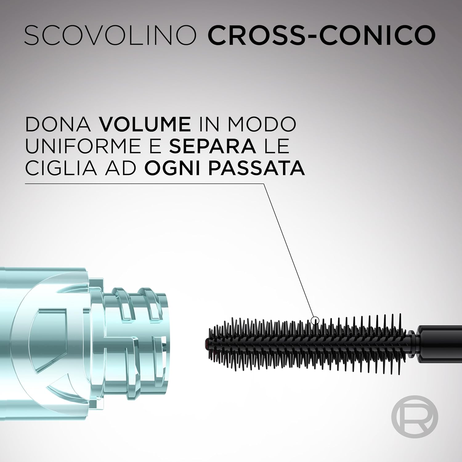 • Cross-conic brush with hybrid length bristles that evenly volumizes and separates lashes