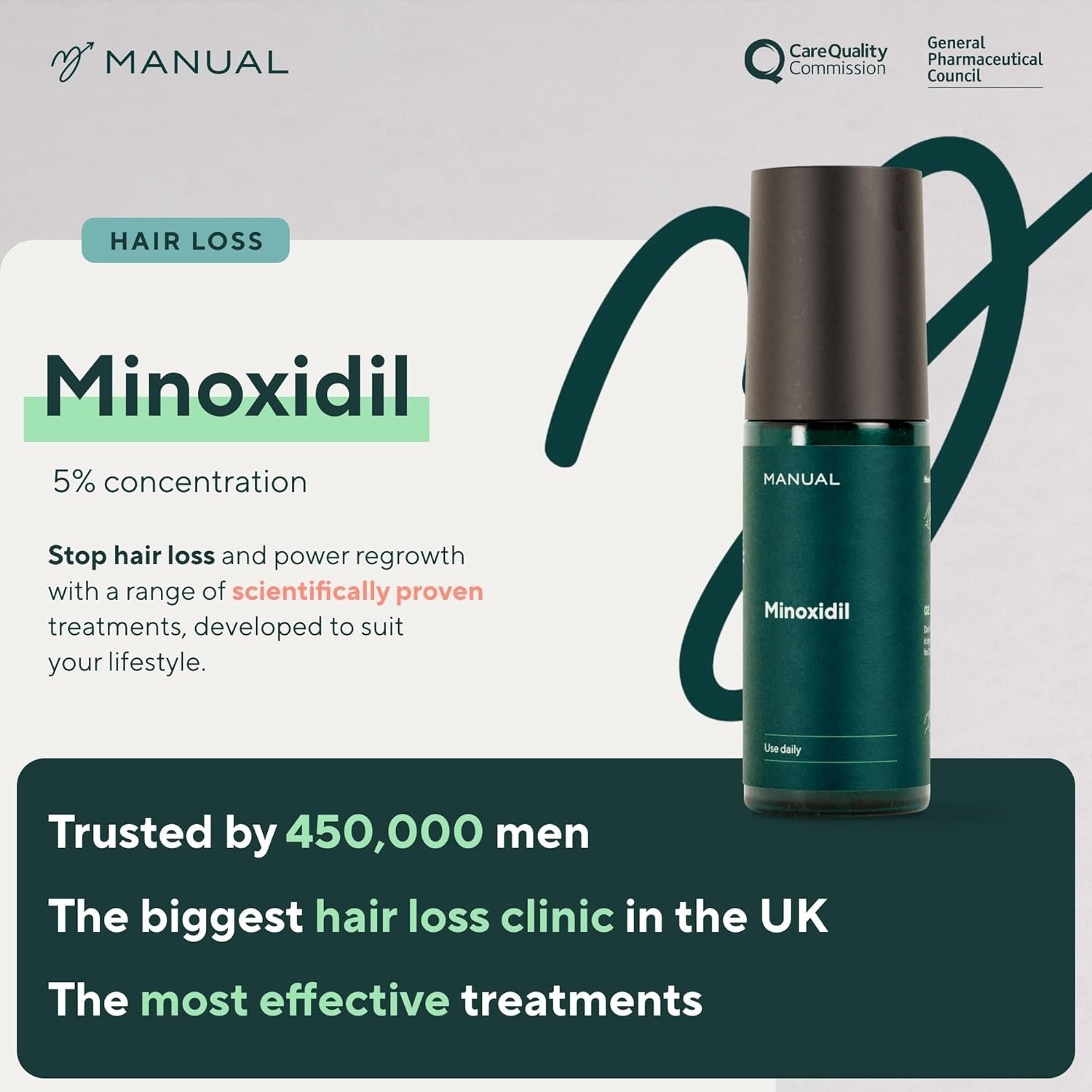 - TARGETED HAIR LOSS TREATMENT: At MANUAL, we combine science, technology and medical expertise to deliver personalised, cutting-edge hair loss treatment that put an end to hair loss. Minoxidil, one of our most popular medical treatments, and is scientifically proven to effectively treat hair loss and stimulate regrowth. With targeted treatments, expert advice and unlimited free support, there’s a reason over 200,000 people trust our hair loss plans.