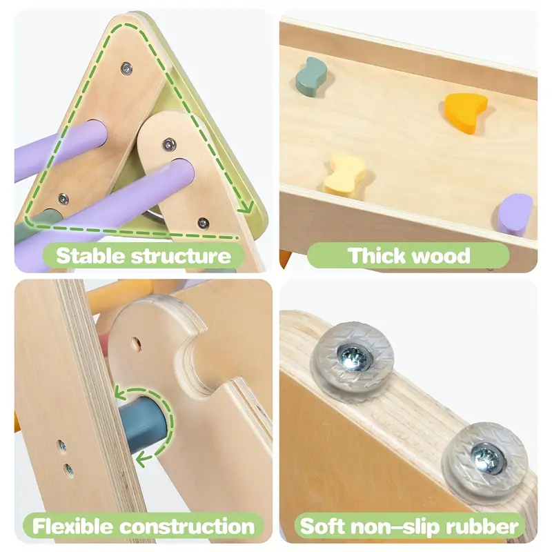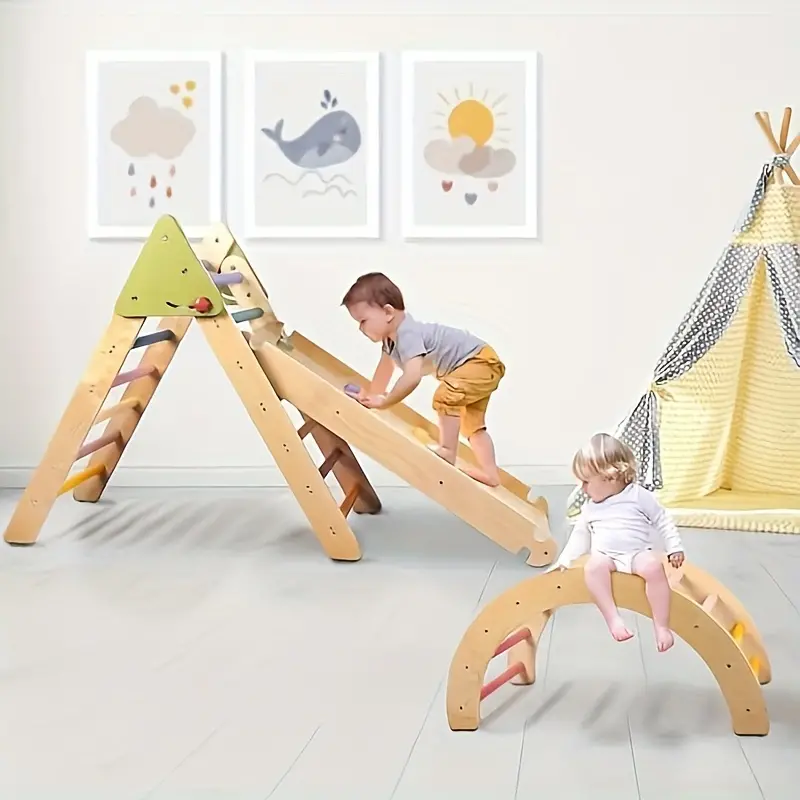 The LOL-FUN Pikler Triangle Set offers toddlers aged 0-3 a safe, Montessori-inspired playground at home. This 5-in-1 indoor climbing set includes a triangle climber, a ramp, and an arch, promoting motor skills, balance, and confidence in little ones. Made of durable, child-safe wood in mixed colors, this foldable set is easy to store and perfect for small spaces. Designed for endless play options, this set provides a stimulating environment for growth and exploration. Ideal for nurturing independence, this 3-piece baby climbing gym is an excellent addition to any playroom, offering hours of developmental fun.