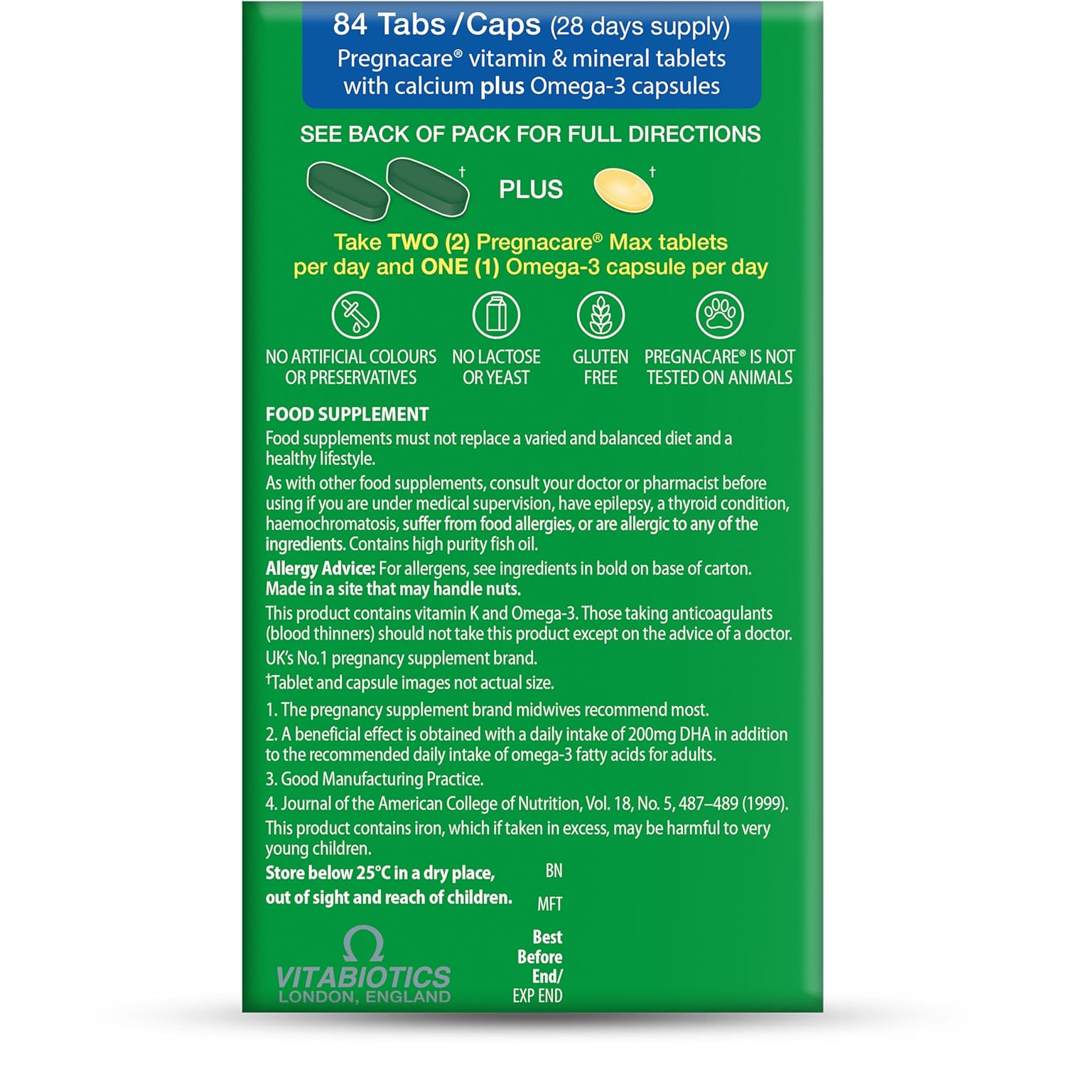 - The pack also contains a 300 mg Omega-3 DHA capsule