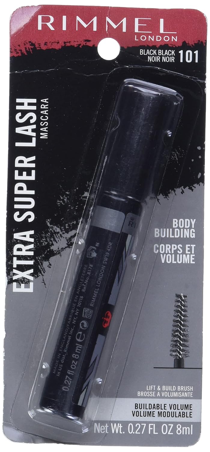 - Package contents: Rimmel Extra Super Lash Mascara, 101 black. The actual packaging may vary.