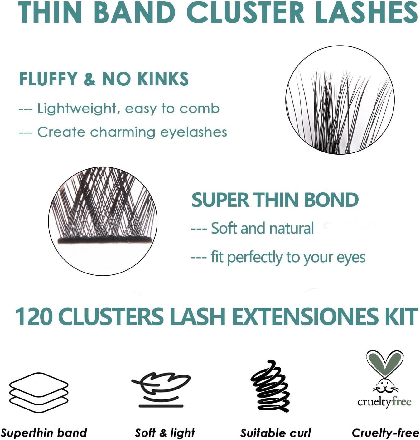 - Made of synthetic fiber, the cluster lashes are lightweight, soft, comfortable, and easy to apply. The long-lasting lash bond and seal make sure the false eyelashes stay on all day. Clean the eyelash glue from the false eyelashes after use and put them back in place, they can be reused.