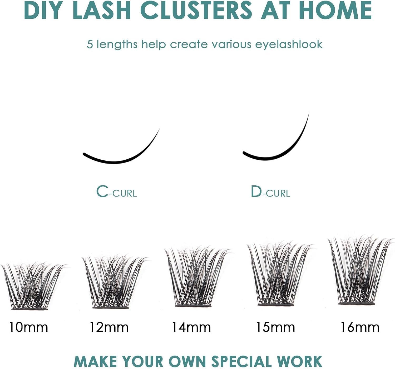 - 5 different sizes of eyelash extensions. It’s flexible for you to create virtually any look that you desire by the Individual cluster lashes. Individual lashes kit contains eye lashes of 10mm 12mm 14mm 15mm 16 mm length, which can be matched according to your needs. Infinite possibilities to create countless lash looks at home. An ideal cluster lash kit for makeup beginners.