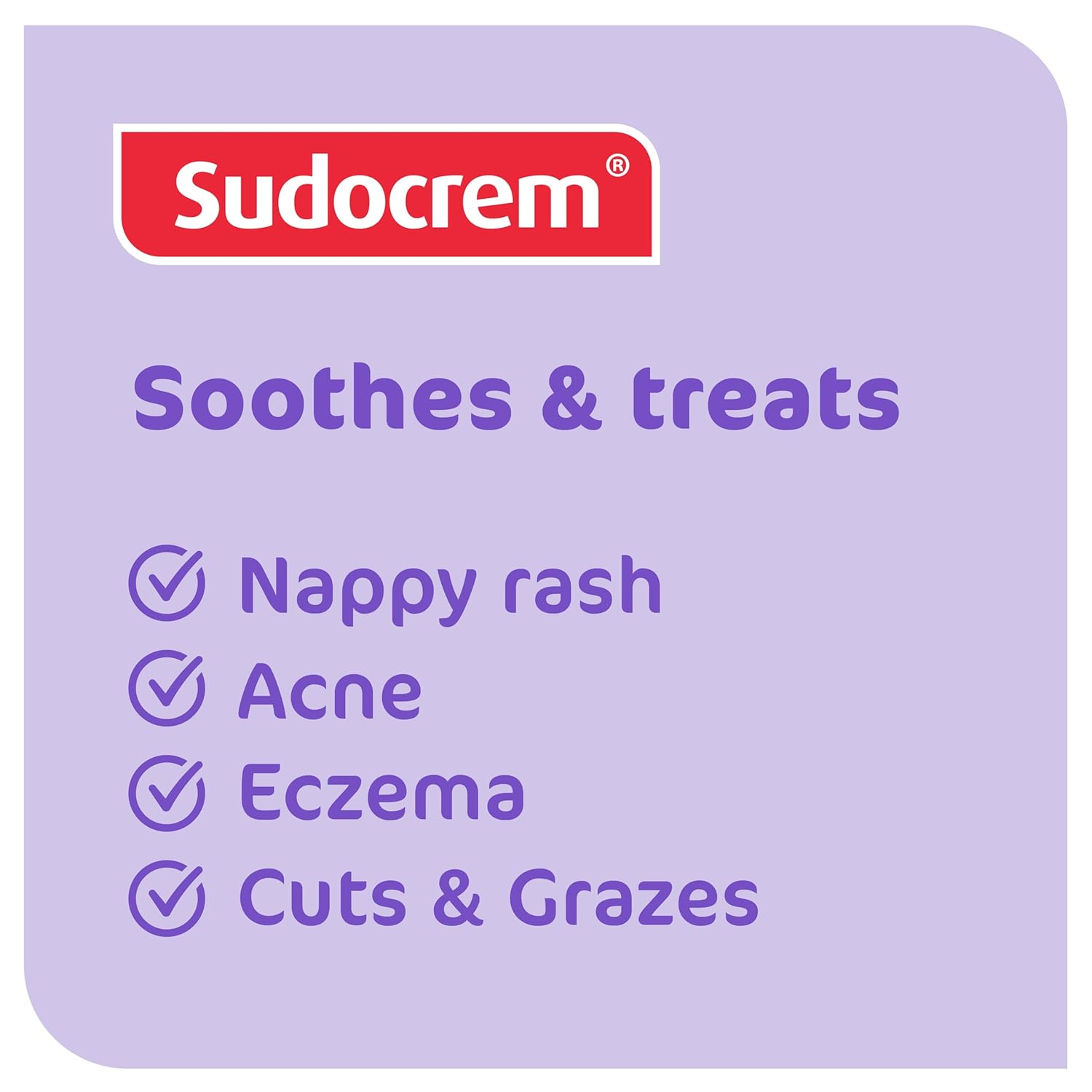- MULTI USE, treats nappy rash, acne, eczema, minor wounds, bed sores, sunburn, minor burns, and chilblains. Sudocrem is an antiseptic cream and zinc oxide cream with antibacterial and antifungal properties.