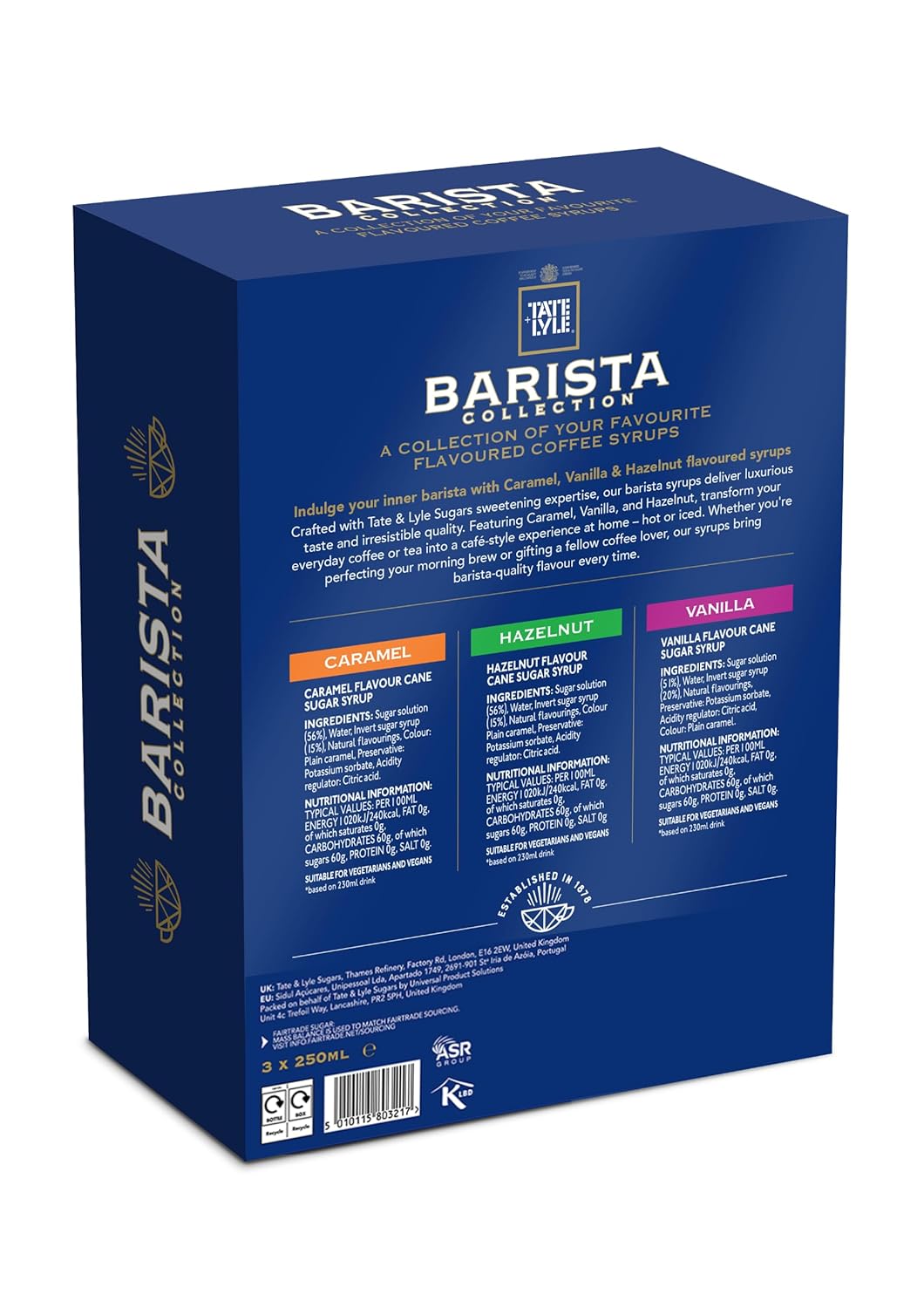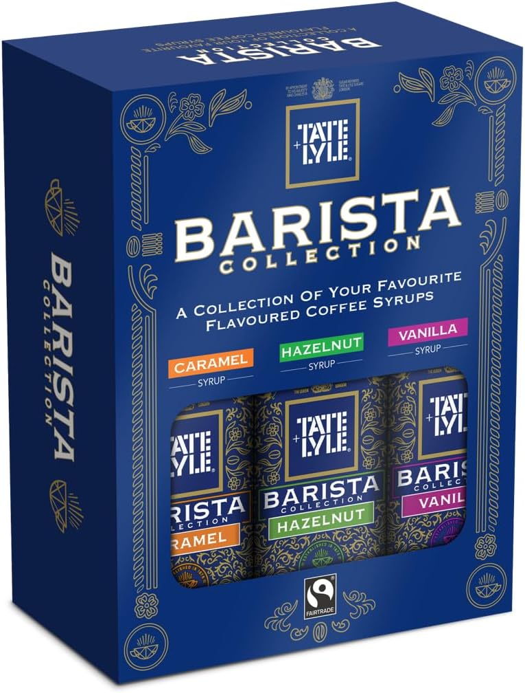 - BARISTA COLLECTION GIFT SET: A trio of Caramel, Vanilla and Hazelnut syrups, each crafted by Tate & Lyle’s. Part of the Barista Collection, suitable for making flavoured hot and cold drinks at home or to share with fellow coffee lovers.