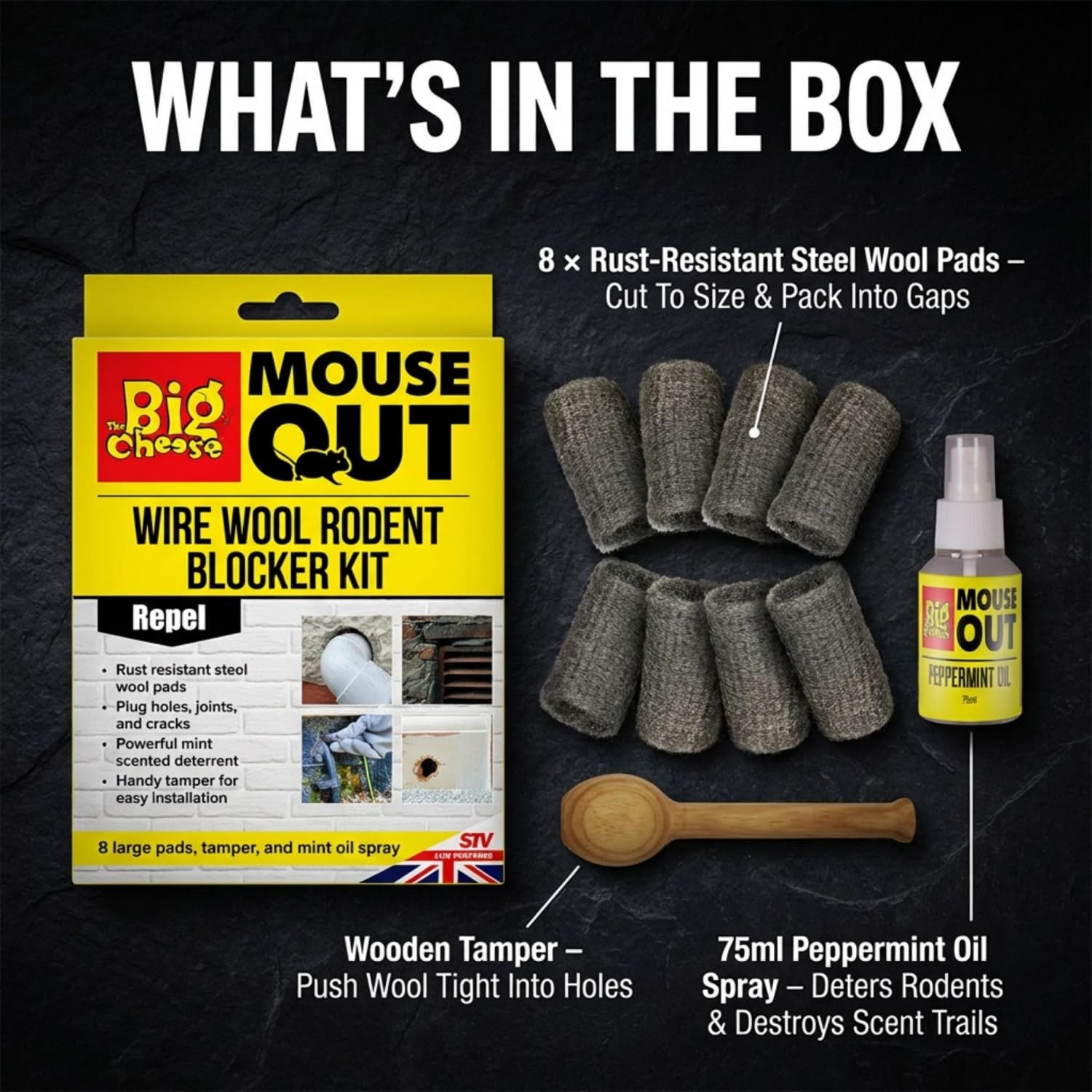 The Big Cheese Mouse Out Wire Wool Rodent Blocker Kit – Steel Wool Pads, Wooden Tamper & Peppermint Oil Spray – Blocks Holes, Gaps & Entry Points – Poison-Free Mouse & Rat…