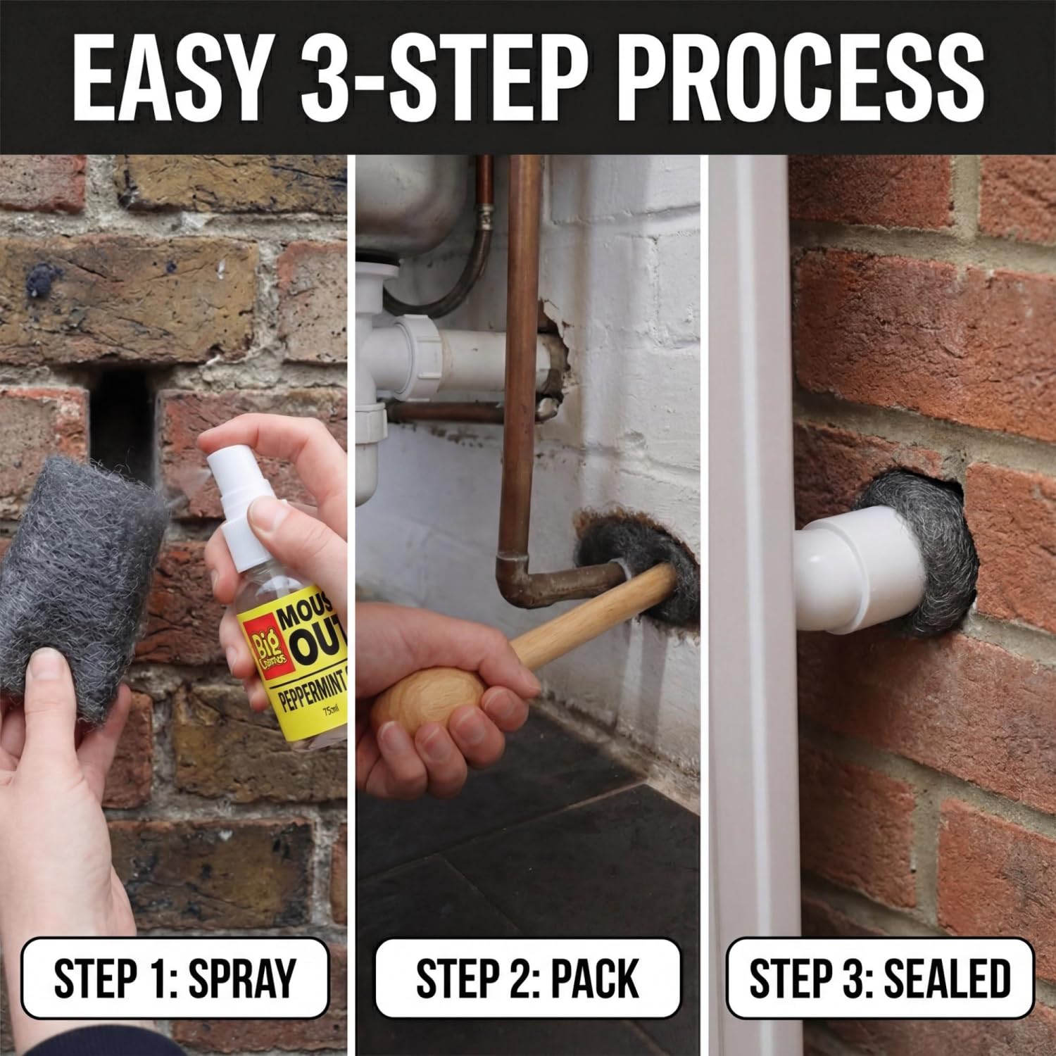 • PEPPERMINT OIL DETERRENT: Spray the included Mouse Out Peppermint Oil onto the wire wool before packing – the powerful mint scent destroys rodent odours and pheromone trails, actively deterring mice and rats from returning to treated areas