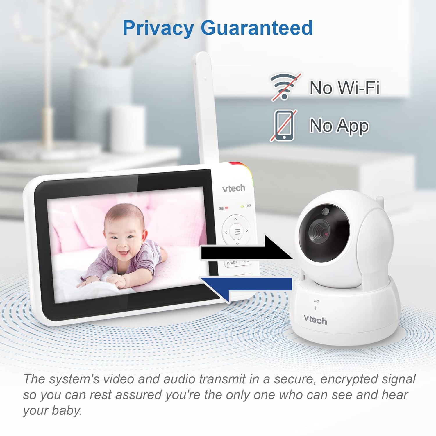 - [ Long Range Secure Transmission] – With up to 1,000 feet of range, you can go about your day and stay connected with your baby from another room or even from the yard. The system’s video and audio transmit in a secure, encrypted signal so you can rest assured you’re the only one who can see and hear your baby